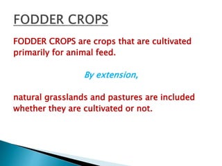 Fodder crops are crops cultivated primarily for animal feed. Alfalfa (Medicago sativa) is considered the "Queen of fodder crops". It is a perennial legume with trifoliate leaves and purple flowers. Alfalfa is high in proteins, vitamins, and minerals and is the world's highest protein feed. It is predominantly grown in the United States, Argentina, and Canada. While alfalfa provides excellent nutrition, factors like saponins and phytoestrogens can potentially cause issues if not properly managed.