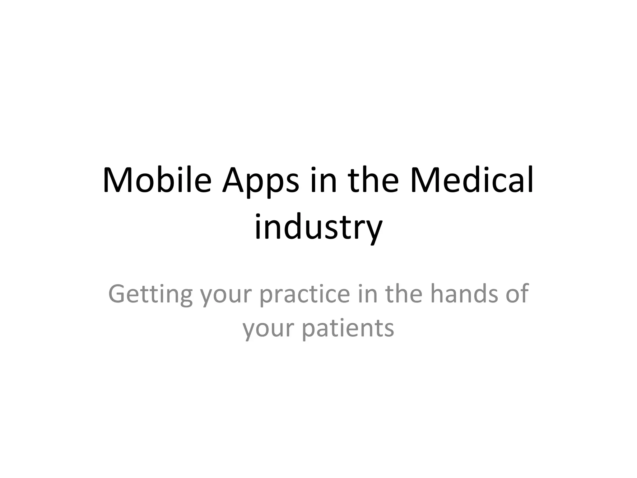 Mobile apps provide medical practices convenient access for patients while enhancing marketing efforts. Some key benefits include always being available to users, allowing practices to analyze usage statistics, and enabling patients to easily access important information and make appointments. Mobile apps also give practices opportunities to promote special offers through coupons and notifications as well as link to social networks for additional marketing exposure. Medical practices can create custom apps through affordable monthly plans starting at $29.