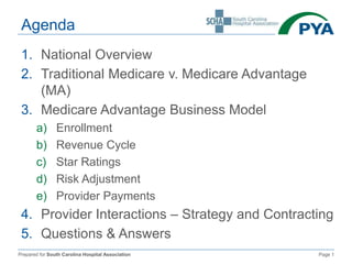 The document outlines the key aspects of Medicare Advantage (MA) plans, focusing on their business model, enrollment, revenue cycles, and provider payments. It compares MA with traditional Medicare, detailing factors such as star ratings, risk adjustment, and payment structures to providers. Additionally, it discusses success factors and strategic considerations for MA plans in the healthcare landscape.