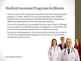 There are several types of medical assistant programs available in Illinois, including programs focused on medical assisting, administration, day classes, or evening classes. Students should research accredited schools and choose between programs based on their preferred focus and schedule.