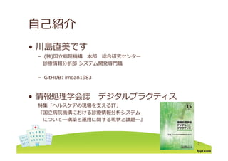 国立病院機構における診療情報分析について @医療ビッグデータ勉強会 第2回 http://peatix.com/event/71536 以前、第36回データマイニング+WEB@東京でお話した内容を改変したものです
