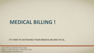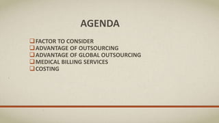 This document outlines the benefits of outsourcing medical billing services to a third party provider. It discusses five key factors to consider, including increasing revenue through reduced errors and costs. Outsourcing allows practices to focus on patient care instead of billing. Costs are reduced through economies of scale and outsourcing to countries like India with lower labor costs. The provider then details their full medical billing cycle and contact information.