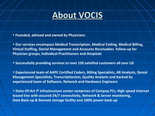 Vocis provides comprehensive medical billing, coding, and collections services for healthcare offices, focusing on cost savings and improved operational efficiency. Their offerings include medical transcription, denial management, and a web-based software solution that enhances patient experience and reduces claim rejections. Backed by a certified team and state-of-the-art IT infrastructure, Vocis supports over 150 clients across the U.S.