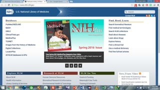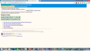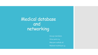 This document discusses medical databases and networking. It provides background on what databases and medical databases are. It then discusses the origin and classification of medical databases. Several specific medical databases are listed and described briefly. The document also discusses the National Library of Medicine's role in developing search and retrieval programs. Key databases like MEDLINE and GPnotebook are summarized. The relationship between networking and databases is explored, how they enable data sharing and integration. Problems that arose and developments that helped advance medical databases and networking are noted.