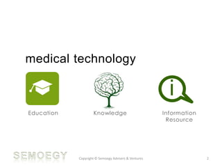 The document provides an overview of medical technology education, focusing on the definition and regulation of medical devices. It details the attributes and intended purposes of medical devices, as well as the regulatory frameworks across various countries. Additionally, it highlights the distinction between medical devices, pharmaceuticals, and biologics, and includes examples of medical devices and their functions.