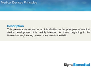 This document introduces the principles of medical device development, targeting beginners in biomedical engineering. It covers definitions, the product development process, regulations, and bioethics while detailing engineering disciplines and the importance of patient safety in device regulation. It also emphasizes the role of biomedical engineers in creating devices that diagnose and treat diseases, with a focus on ethical considerations and effective regulatory practices.