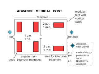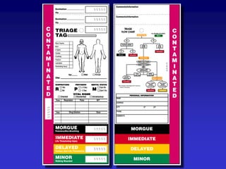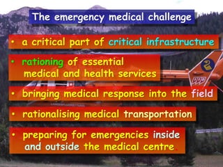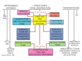 This document discusses emergency medical service planning for disasters. It covers triage, which involves classifying patients based on who would benefit most from immediate medical attention. An advance medical post provides initial stabilization near the disaster site. Field hospitals can substitute for damaged hospitals but have challenges. Mass casualty management involves search and rescue, medical care, disease monitoring, and mortuary services. Temporary morgues are needed to identify victims and determine causes of death. Overall, effective EMS planning requires coordination across various emergency response plans and medical facilities.
