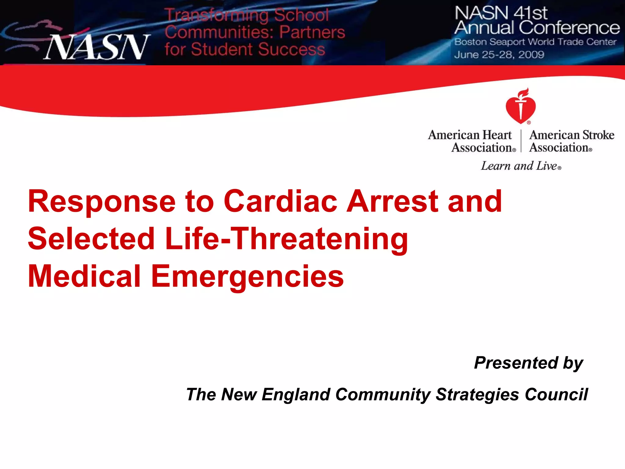 1. The document discusses strategies for responding to cardiac arrest and other life-threatening medical emergencies in schools. It emphasizes the importance of having a coordinated emergency response plan, training and equipment for first aid and CPR, and potentially an AED program.