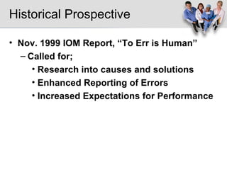 1. The document discusses various methods that have been used to track and reduce medical errors, including chart reviews, self-reporting, and direct observation. Errors are often caused by systemic issues rather than individual mistakes.