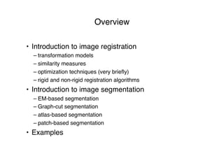 This document provides an overview of medical image registration and segmentation techniques. It summarizes image registration as transforming one image to align with another by optimizing a similarity measure. It describes registration of different images of the same subject (intra-subject), different subjects (inter-subject), and images over time (serial registration). It also summarizes segmentation techniques including EM-based, graph-cut, atlas-based, and patch-based segmentation.