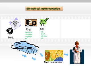This document discusses biomedical instrumentation and provides an overview of the subject in 3 sentences. It mentions that biomedical instrumentation involves engineering, science, and medicine. It also involves medical instruments, biology, chemistry, physics, electricity, computers and cognitive sciences. It then lists John D. Enderle and Metin Akay as references on the topic of bioinstrumentation and medical devices and instrumentation.