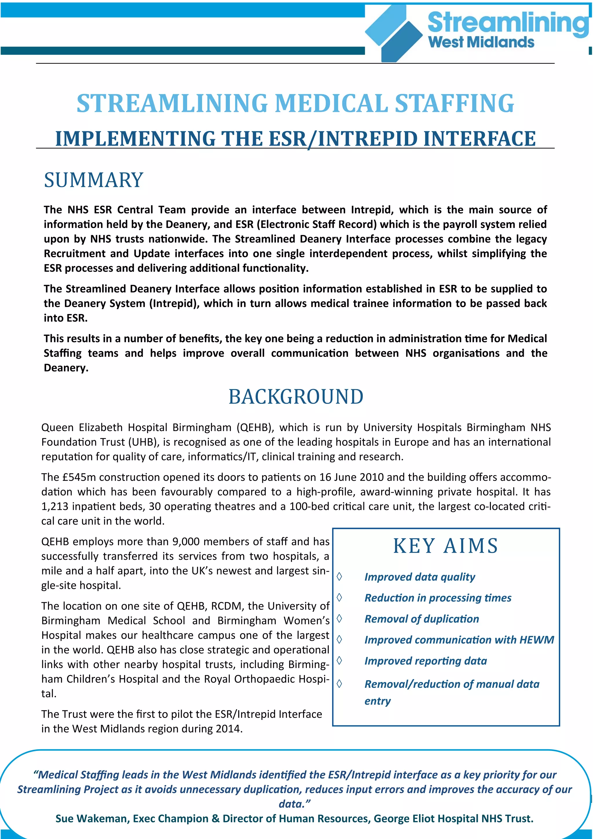 The document discusses implementing an interface between the Intrepid database used by the Deanery and the NHS trusts' ESR payroll system. The interface automates transferring trainee information between the systems, reducing manual data entry and improving data accuracy and communication between organizations. It describes how Queen Elizabeth Hospital Birmingham piloted the interface, the benefits of reduced administration time and errors, and advice for other trusts implementing the interface.