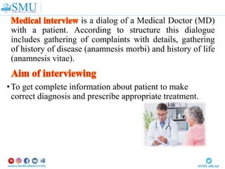 The medical interview document outlines the structure and goals of a medical interview between a doctor and patient. The interview includes gathering information about the patient's complaints, medical history, and life history to make an accurate diagnosis and treatment plan. It discusses the importance of establishing rapport, actively listening to understand the patient's perspective, and providing information to the patient in an understandable way. The doctor aims to understand the patient's health concerns and ensure informed consent during the medical interview process.