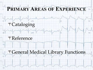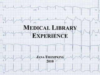 Jana Thompkins' 2010 medical library experience included cataloging print and electronic materials according to MARC guidelines, performing literature searches using databases like Medline and CINAHL for professors, and providing services to nursing students such as training in research techniques, a Table of Contents service, DOCLINE transactions, and auditing and replacing outdated print materials.