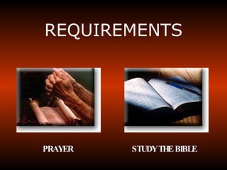 This document discusses the requirements and importance of prayer, Bible study, and proclaiming the gospel as a medical missionary. It emphasizes that prayer, studying the Bible, and keeping the lamp of truth illuminated are essential. It also stresses that medical missionary work is the right arm of the gospel and an important part of spreading God's message to others.