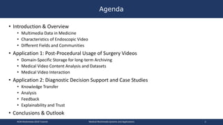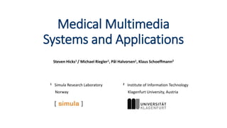 This document provides an overview of medical multimedia systems and applications. It discusses the use of multimedia data in medicine, including medical images, videos, and sensor data. A focus is placed on endoscopic video, including its characteristics, domains, and challenges. Applications of medical video are explored, such as post-procedural usage for documentation, training, and quality assessment. Techniques for pre-processing, analyzing, and summarizing medical video are also presented.