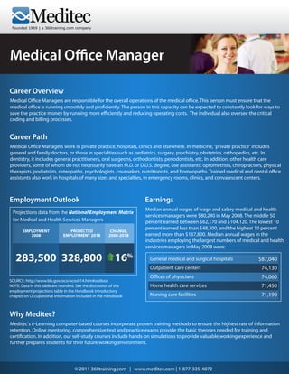 Medical office managers are responsible for overseeing the overall operations of a medical office to ensure it runs smoothly and efficiently. This includes looking for ways to reduce costs through more efficient operations and coding and billing processes. Medical office managers work in various healthcare settings like private practices, hospitals, clinics, and other facilities. They oversee administrative functions and aim to save the practice money through cost reductions.