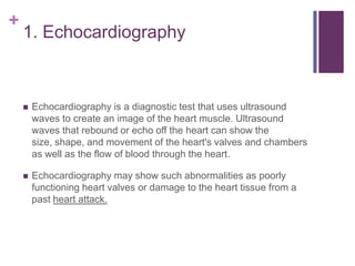 Echocardiography uses ultrasound to create images of the heart. It can show the size and shape of chambers and valves, detect abnormalities, and evaluate heart function. Doppler echocardiography uses sound wave speed and direction to measure blood flow through the heart and valves. A Holter monitor continuously records heart electrical activity over 24 hours to detect irregular heartbeats that may not appear during other tests. Both tests are noninvasive and provide information to diagnose cardiovascular conditions.