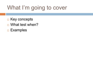 Examples are provided to demonstrate how to select the appropriate test based on the data type and study design.