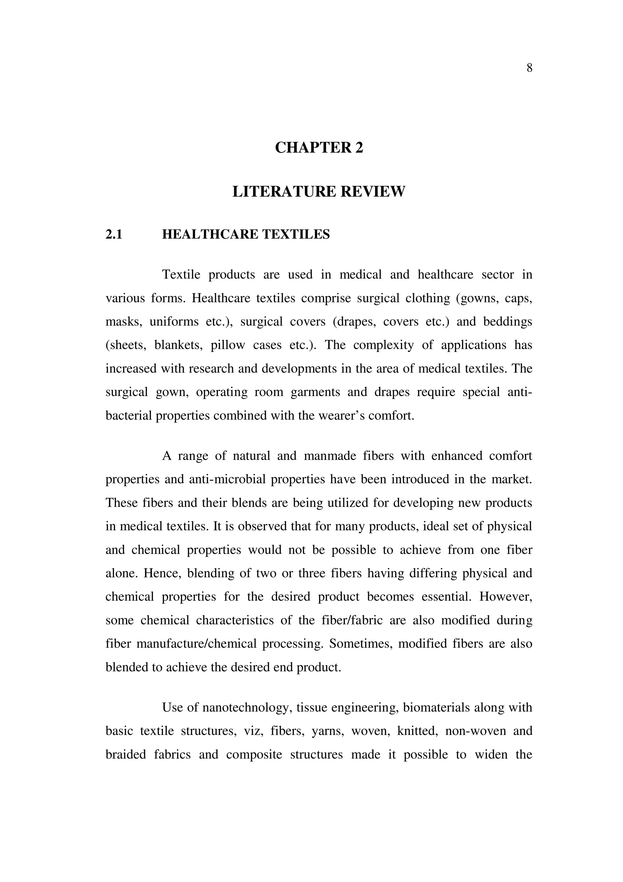 This document provides a literature review on healthcare textiles. It discusses the types of textiles used in healthcare like surgical gowns, drapes, and bed linens. These textiles require special properties like antibacterial properties and comfort. A range of natural and man-made fibers with enhanced properties have been developed for healthcare textiles. Blending fibers is often necessary to achieve desired product properties. The document then focuses on the properties and use of lyocell fiber for healthcare textiles.