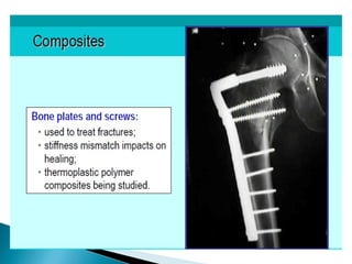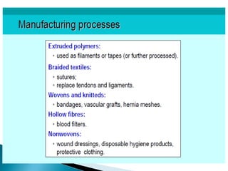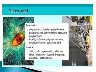 This document discusses medical textiles. It begins by defining medical textiles as textile materials engineered to meet medical needs where strength, flexibility, moisture permeability are required. There are four main categories of medical textiles: non-implantable materials like bandages; extracorporeal devices like artificial organs; implantable materials like sutures and grafts; and healthcare/hygiene products like gowns and bedding. The document outlines properties required for different medical textiles and common fiber types used. It also discusses manufacturing processes and recent developments in the field.