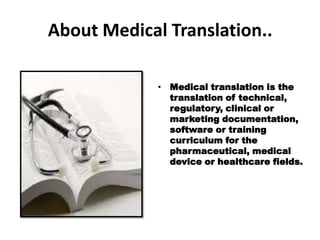 Medical translation involves converting technical medical documents into other languages, through a multi-step process of extraction, translation, editing, publishing, proofreading, and in-country review. The international medical industry requires high quality translation certified under standards like ISO 9001, EN 15038, and ISO 13485. Word Perfect is a translation agency that can provide certified medical interpreters and translations to meet various needs.