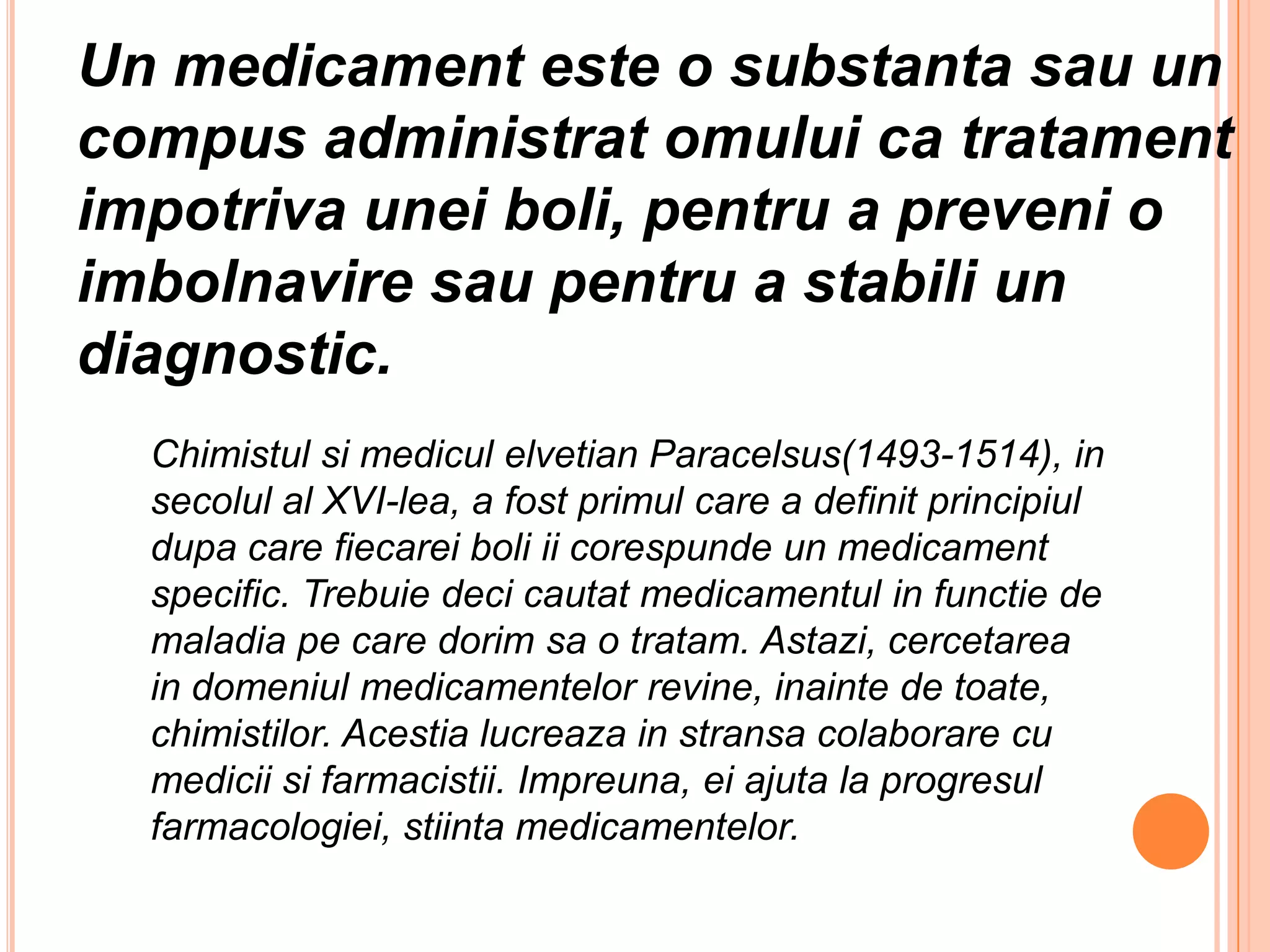 Medicamentele sunt substanțe utilizate pentru tratarea sau prevenirea bolilor, având principii active extrase din plante sau sintetizate chimic. Producția unui medicament implică numeroase etape de cercetare și testare, inclusiv evaluarea eficacității și siguranței pe animale și oameni. Antibioticele, o categorie importantă de medicamente, acționează prin distrugerea bacteriilor sau inhibarea dezvoltării acestora și sunt utilizate în tratarea infecțiilor.