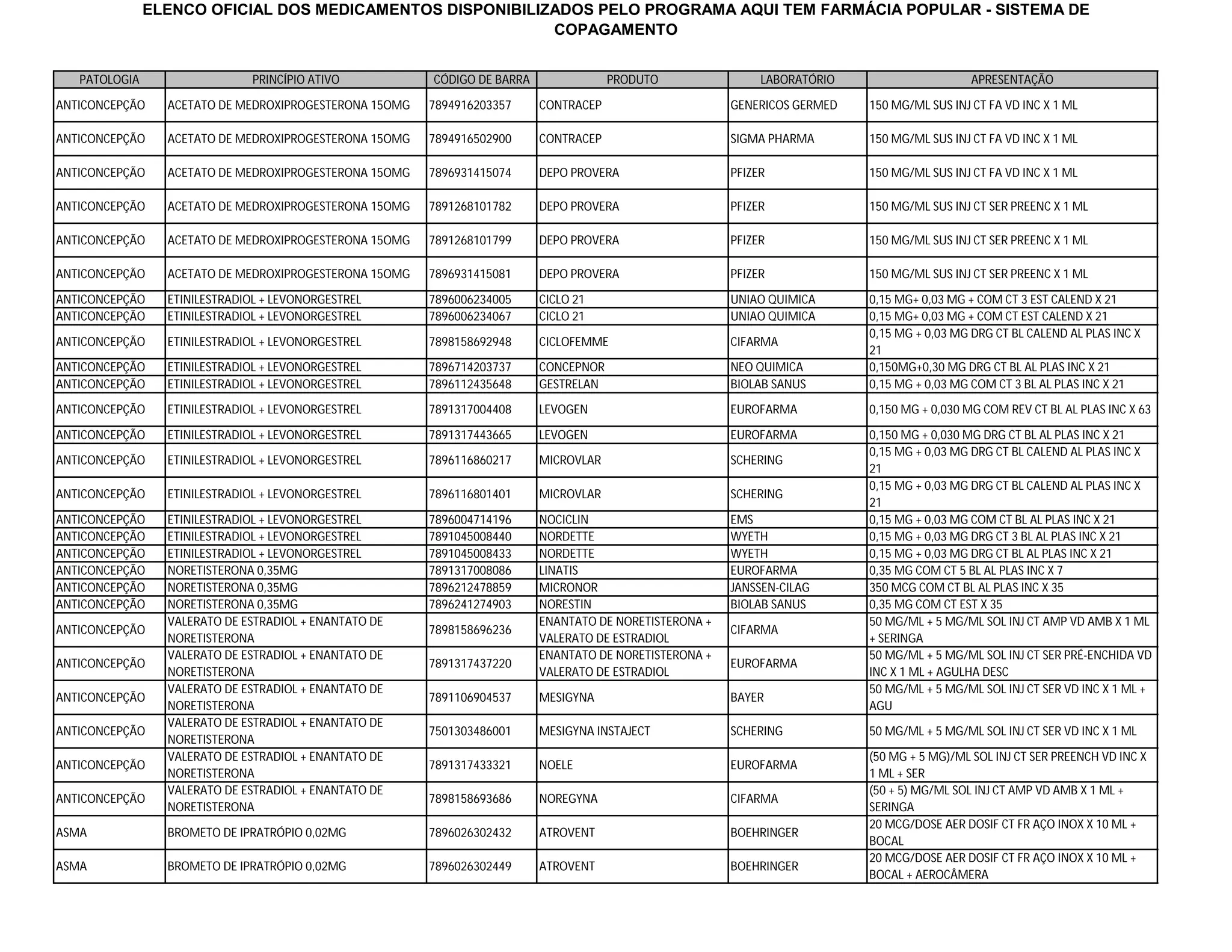 The document lists medications available through the Popular Pharmacy Program in Brazil. It includes the medical condition or pathology, active ingredient, barcode, product name, manufacturer, and presentation for each medication. The list contains medications for contraception, asthma, and other conditions. The contraception section includes various oral contraceptives, injections, and implants. The asthma section lists several inhalers containing ipratropium bromide and beclomethasone dipropionate.
