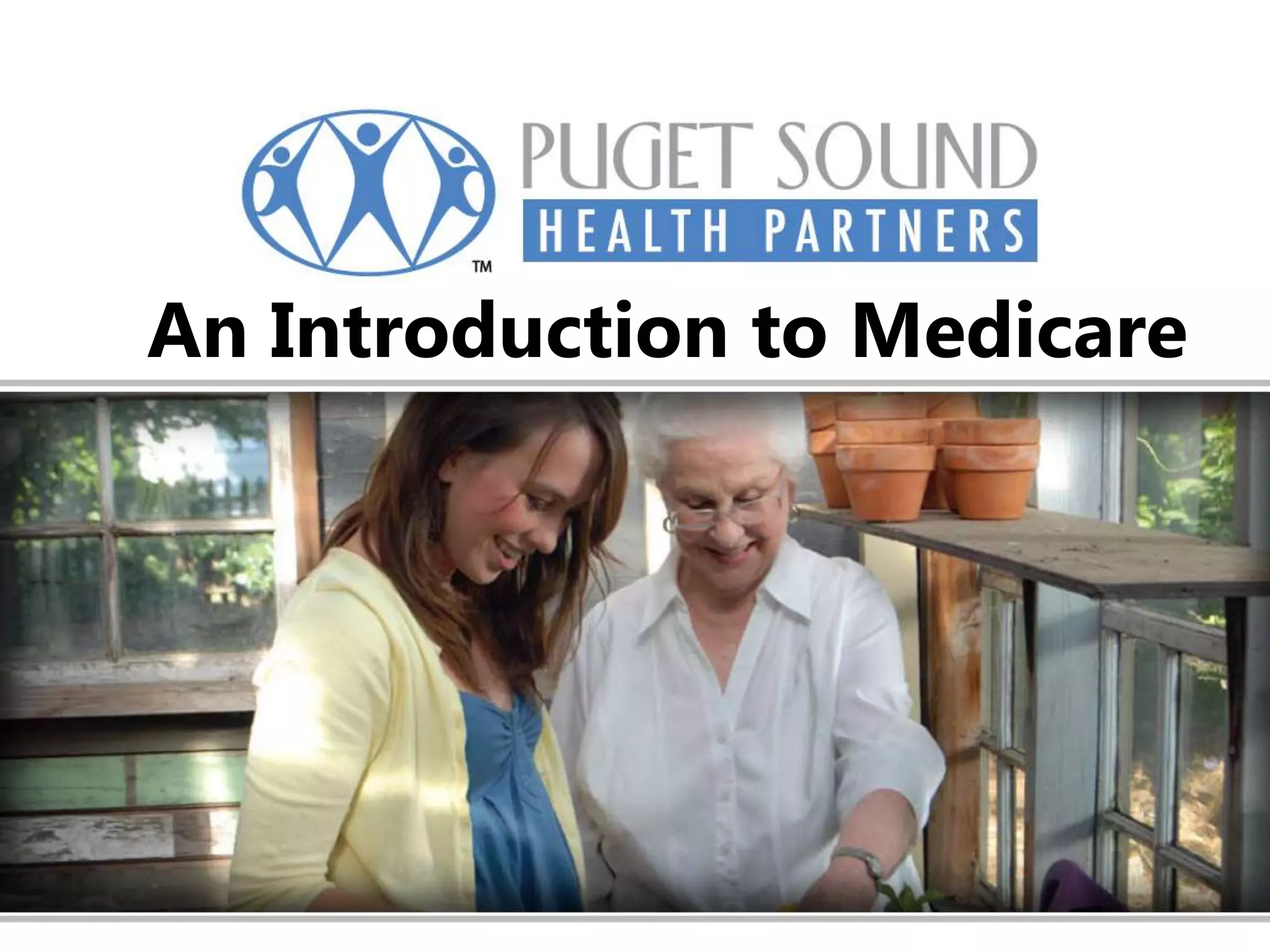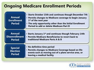 This document provides an overview of Medicare including eligibility, coverage under Parts A, B, C, and D, costs, and supplemental plans. Original Medicare has inpatient coverage under Part A but beneficiaries pay deductibles and coinsurance. Part B covers outpatient services and providers are reimbursed fee-for-service. Medicare Advantage plans provide all Medicare benefits and may offer extra benefits for a monthly premium. Part D prescription drug plans have a standard benefit design including a deductible, coverage gap, and catastrophic coverage. The document also reviews enrollment periods and offers resources for additional information.