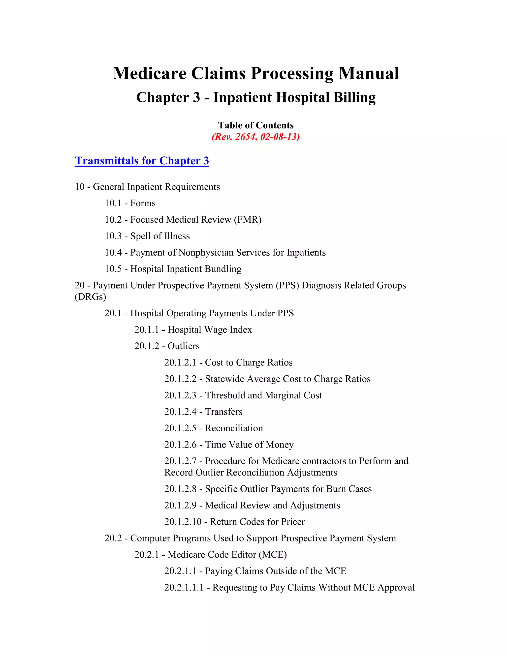 This document provides a summary of Medicare claims processing procedures for inpatient hospital billing. It outlines the table of contents which includes sections on general inpatient requirements, payment under the prospective payment system (PPS) diagnosis-related groups (DRGs), additional payment amounts for disproportionate share hospitals, rural hospital flexibility programs, billing coverage and utilization rules, adjustment bills, swing-bed services, and billing instructions for specific situations such as transplants and foreign hospital services. It provides procedural guidance to Medicare contractors for processing inpatient hospital claims.