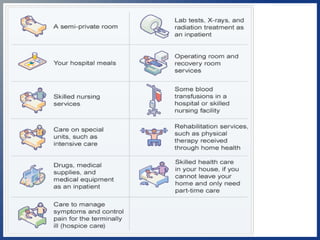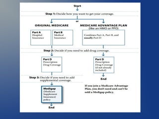 This document provides an overview of the different parts of Medicare (Parts A, B, C, D) and Medicare supplements (Medigap). It explains that Medicare Part A covers hospital insurance, Part B covers medical insurance, Part C are Medicare Advantage plans offered by private insurers that include benefits from Parts A, B and often Part D. Part D is prescription drug coverage. Medicare supplements help cover costs that original Medicare does not. The document provides details on the benefits and requirements of each part/program.