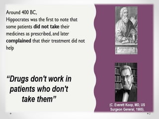 This document discusses medication adherence. It defines medication adherence and explains that it is one of the most important factors in determining therapeutic outcomes, especially for chronic illnesses. The document outlines different types of medication non-adherence, including primary and secondary (both intentional and unintentional) non-adherence. It also discusses various methods for measuring and improving medication adherence.