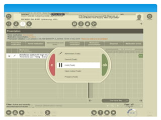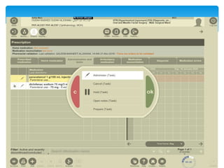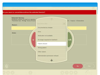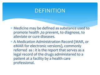 This document discusses medication administration and documentation. It defines medication and medication administration records. Safe medication administration is a major nurse responsibility. Nurses must follow the rights of medication administration which include the right patient, medication, dosage, route, time, documentation, education, refusal, assessment and evaluation. Proper preparation, administration at bedside while verifying patient details, and documentation are emphasized. Documentation must be complete and accurate in medical records. Electronic medication administration records are used to track medication administration and military time is used. Careful transcription to medical charts is important. Reasons for holding or refusing medication must be documented.