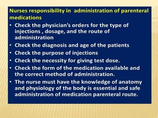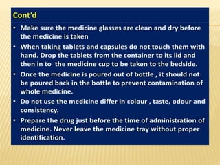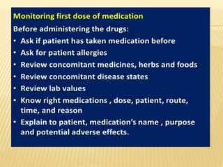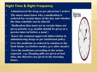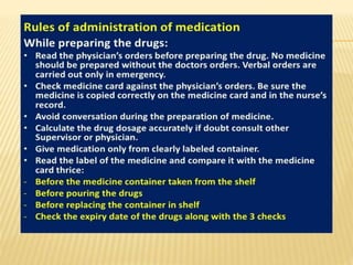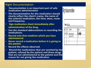 The document outlines medication administration protocols at Bhagat Chandra Hospital, including the importance of clear documentation and monitoring. It emphasizes patients' rights regarding medication, such as informed consent and the ability to refuse treatment. The document also highlights the need for qualified personnel to assess medication history and allergies.