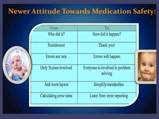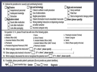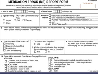This document discusses medication errors, including definitions, types, contributing factors, detection, reporting processes, and prevention. The key points are: