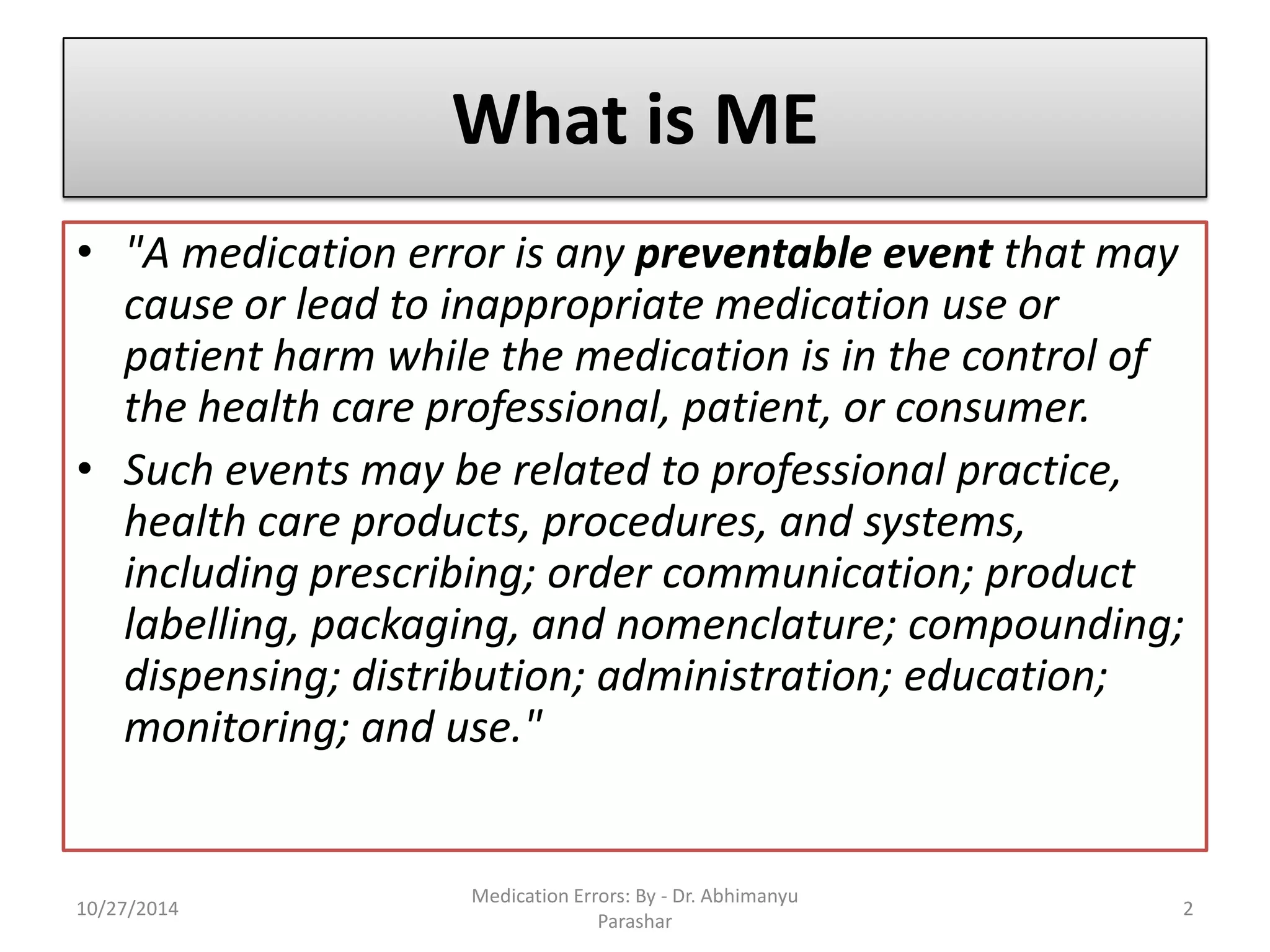Medication errors are preventable events that can cause inappropriate medication use or harm to patients, occurring during various stages including prescribing, dispensing, and administration. Common causes include poor communication, illegible prescriptions, and incorrect drug information, which can lead to different types of errors. Prevention strategies focus on patient education, proper documentation, and leveraging electronic technologies.