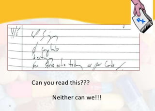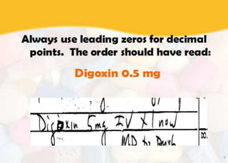 This document discusses medication errors, which are preventable events that may cause inappropriate medication use or patient harm. Medication errors are a significant issue, injuring over 770,000 patients annually in the US alone. Common causes of medication errors include human factors like distractions or lack of knowledge, system factors like poor communication, and medication-related issues like look-alike and sound-alike drug names. Strategies to prevent errors include ensuring legible prescriptions, standardized abbreviations, separate storage of high-risk drugs, labeling all medications, training on error reporting and reconciliation processes. A blame-free culture and dedicated team to analyze errors are also recommended.