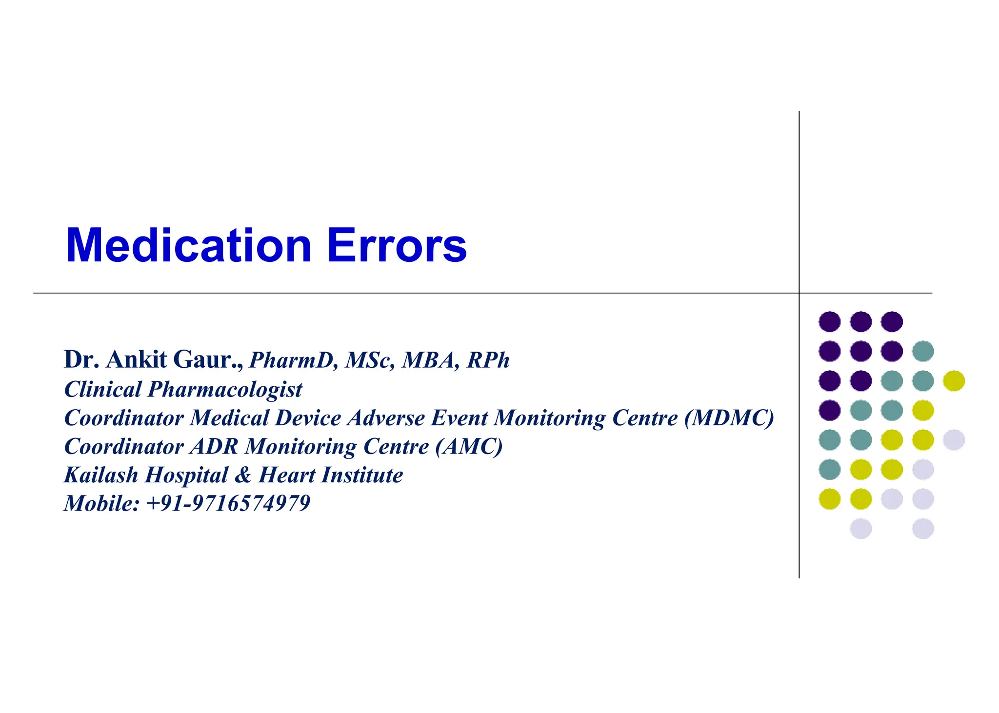 This document discusses medication errors, which are preventable events that may cause inappropriate medication use or patient harm. Medication errors are a significant issue, injuring over 770,000 patients annually in the US alone. Common causes of medication errors include human factors like distractions or lack of knowledge, system factors like poor communication, and medication-related issues like look-alike and sound-alike drug names. Strategies to prevent errors include ensuring legible prescriptions, standardized abbreviations, separate storage of high-risk drugs, labeling all medications, training on error reporting and reconciliation processes. A blame-free culture and dedicated team to analyze errors are also recommended.