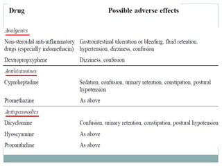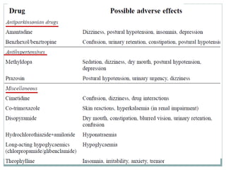 The document discusses challenges in pharmacotherapy for geriatric patients. It notes that illness is more common in older adults, leading to high rates of polypharmacy. Age-related changes can impact absorption, distribution, metabolism and excretion of drugs. This generally results in lower clearance and increased sensitivity to medications. Drug-drug and drug-disease interactions are also more common. The document provides prescribing pearls like starting low doses and avoiding high risk medications. It emphasizes the need for careful monitoring to optimize outcomes for geriatric patients.