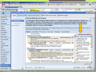 The document provides education on medication reconciliation for nurses. It outlines the nursing responsibilities for medication reconciliation at admission, transfer, and discharge. At admission, nurses are responsible for obtaining an accurate home medication list. Exceptions are noted. Nurses review medication names, doses, frequencies and last dose dates/times and communicate any unclear entries to pharmacists. Nurses also reconcile medications at transfer and ensure complete discharge documentation and instructions.