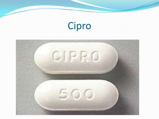 This document provides information on the proper use and potential side effects of three common medications: Ciprofloxacin (Cipro), an antibiotic; Fexofenadine (Allegra), an antihistamine for allergies; and Dextromethorphan (Robitussin), a cough suppressant. For each medication, the summary describes its intended uses, dosage instructions, potential side effects, and important warnings.