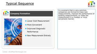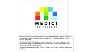 Medici Technologies offers predictive algorithm development and data analytics services to help companies optimize their data for product creation. They provide a structured approach that includes project management, parallel algorithm assessment, and modular tools to enhance internal data analysis capabilities. Medici addresses typical challenges faced by data analysis groups under pressure and enables accelerated, effective problem-solving for smaller life science companies.