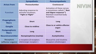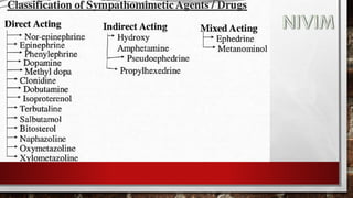 The document provides an overview of the autonomic nervous system, including its structure, function, and neurotransmitters involved, such as norepinephrine and acetylcholine. It also covers adrenergic neurotransmitters, their biosynthesis, catabolism, and receptor distribution, highlighting sympathomimetic agents and their mechanisms. The structure-activity relationships of these compounds are discussed, detailing their pharmacological actions and clinical applications.