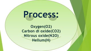 The document discusses medical gases, including their components, containers, production processes, and packaging/labeling. The key gases covered are oxygen, nitrogen, carbon dioxide, nitrous oxide, and helium. Oxygen production methods described are fractional distillation of liquid air and electrolysis of water. Cylinders and liquid storage tanks are used as containers. Strict labeling requirements include the batch number, production/expiry dates, quantity, and supplier information. Proper packaging and labeling controls are important for medicinal gases.