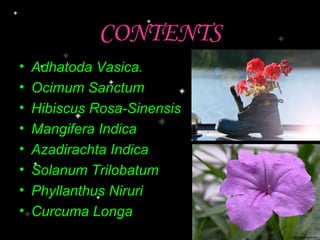 This document provides information on the medicinal uses of several plants that are commonly found in India. It discusses 8 plants - Adhatoda Vasica, Ocimum Sanctum, Hibiscus Rosa-Sinensis, Mangifera Indica, Azadirachta Indica, Solanum Trilobatum, Phyllanthus Niruri, and Curcuma Longa. For each plant, it provides their family name, other names in languages like Hindi and Tamil, parts of the plant used for medicine, and their medicinal properties and uses to treat various diseases.