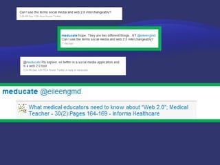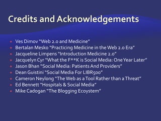 This document discusses the concept of Medicine 2.0 and how doctors can utilize various online tools and platforms. It defines Medicine 2.0 as using web tools like blogs, podcasts, and social media to personalize healthcare, collaborate, and promote health education. It provides examples of how hospitals are using social media for customer service, education, recruitment and more. It also discusses specific tools in Medicine 2.0 like RSS feeds, podcasts, blogging, and social networks and how doctors can leverage them.