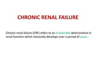 Chronic renal failure refers to the irreversible deterioration of renal function over years. It initially presents as biochemical abnormalities and eventually leads to uraemic symptoms as the excretory, metabolic and endocrine functions of the kidneys fail. Common causes include diabetes, hypertension, and glomerulonephritis. Management involves identifying and treating the underlying disease, slowing progression, managing complications, and renal replacement therapy for end-stage disease.
