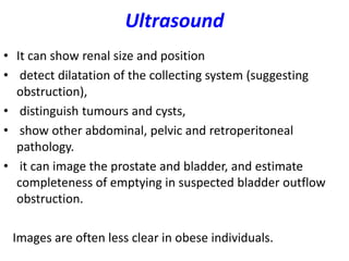 This document describes various imaging techniques used to evaluate the kidneys, including plain X-rays, ultrasound, intravenous urography, pyelography, arteriography, computed tomography, magnetic resonance imaging, and radionuclide studies. It also discusses renal biopsy indications, contraindications, complications, and how to prepare for the procedure. The imaging techniques can identify renal and urinary tract abnormalities while renal biopsy provides kidney tissue for analysis.