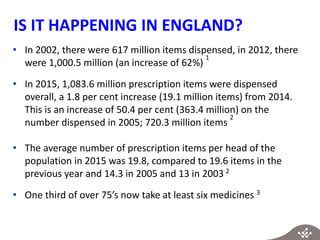 The document discusses the rise in polypharmacy in England, highlighting the increase in prescribed medications and the associated risks, including hospital admissions and medication errors. It outlines a workshop aimed at developing national polypharmacy prescribing indicators with input from various healthcare stakeholders. The document emphasizes the importance of medication reviews as patients age and provides recommendations for ensuring safe prescribing practices.