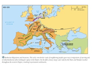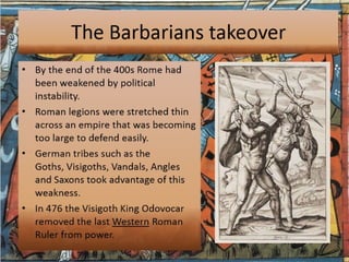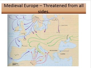 The document provides an overview of life in Medieval Europe from 500-1500 AD, known as the Middle Ages or Medieval period. It summarizes that the period began with the collapse of the Roman Empire and was characterized by the rise of feudalism and manorialism, the growing power of the Catholic Church, and the conflicts between Christians and Muslims, such as the Crusades. Key developments included the establishment of monarchies and nation-states, the spread of Christianity, and the founding of universities that helped revive learning.